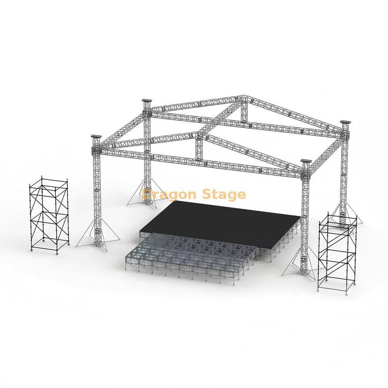 Para fornecer uma solução completa para o local, este telhado piramidal foi projetado para integração perfeita com nossas plataformas modulares de alumínio. Esses decks apresentam superfícies antiderrapantes de 18 mm e alta capacidade de suporte de carga, criando uma base profissional e segura para os artistas sob a enorme plataforma suspensa (Fonte: https://www.dragontruss.com/Aluminum-Stage-Platform-pd463987768.html ).