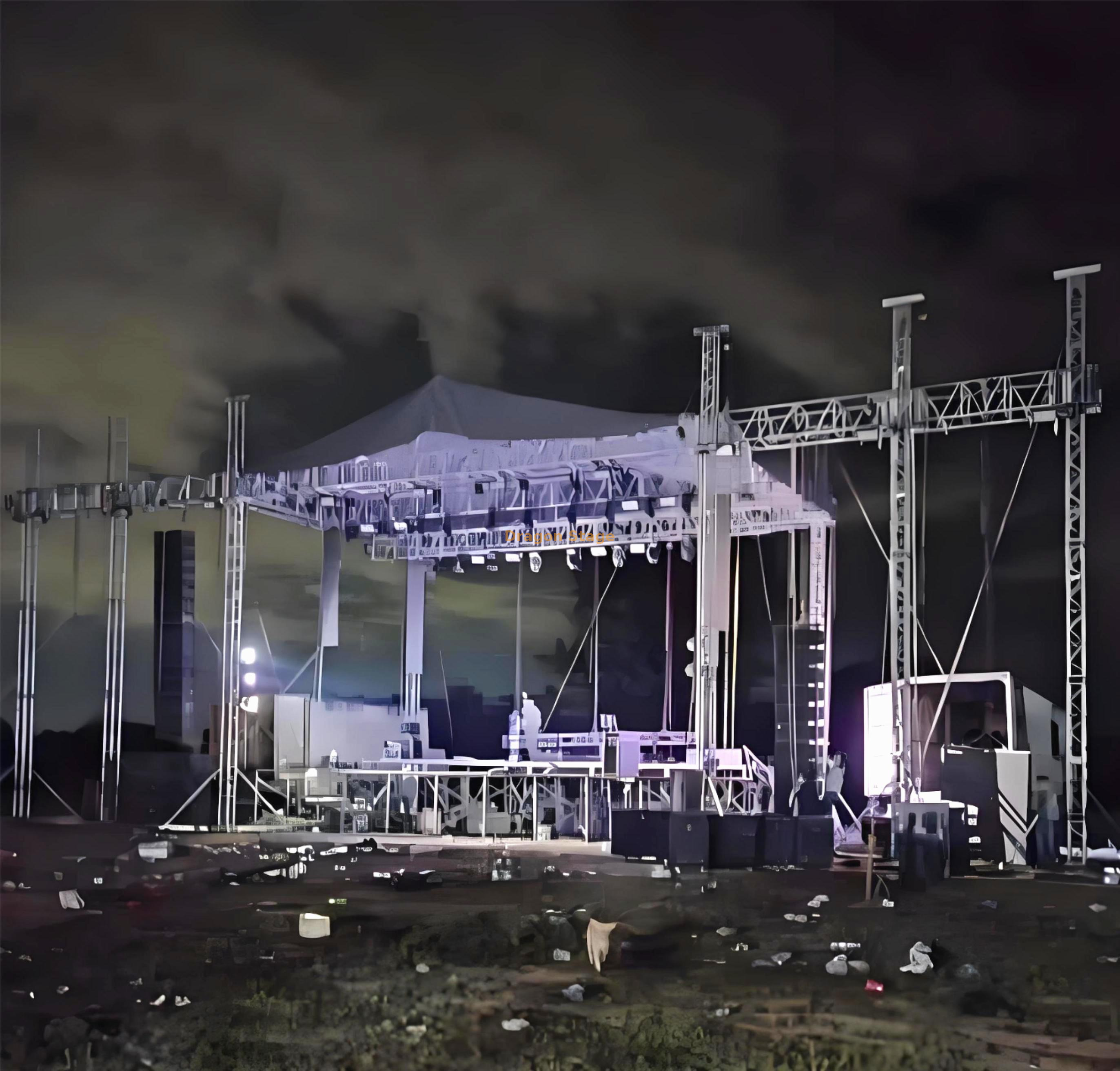 Este palco de treliça de telhado de iluminação de alto-falante de alumínio para serviço pesado personalizado é uma estrutura de nível profissional projetada para concertos ao ar livre e grandes eventos, oferecendo suporte robusto para iluminação pesada e sistemas de alto-falantes. A cobertura do palco principal oferece uma ampla área de atuação de 8m x 6m (aproximadamente 26,2 pés x 19,7 pés) e fica a uma altura de 8m (aproximadamente 26,2 pés).