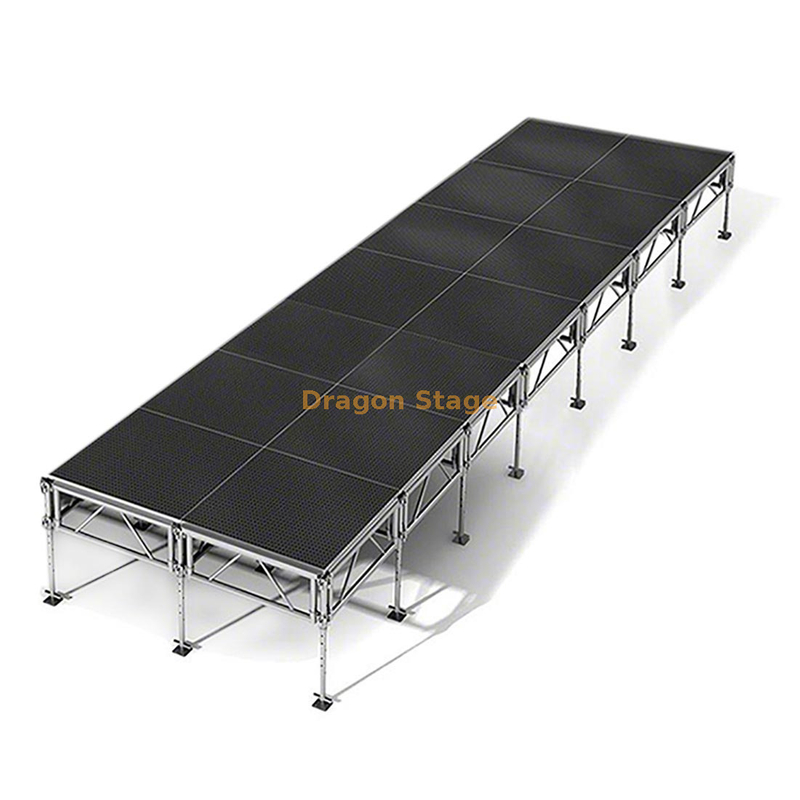 Adaptabilidade superior em todo o terreno: Apresentando um conjunto robusto de pernas ajustáveis, este palco pode ser ajustado em qualquer altura de 0,4 m a 2,0 m. Os pés projetados com precisão permitem uma estabilidade sólida, mesmo em declives, meios-fios ou terrenos externos irregulares.