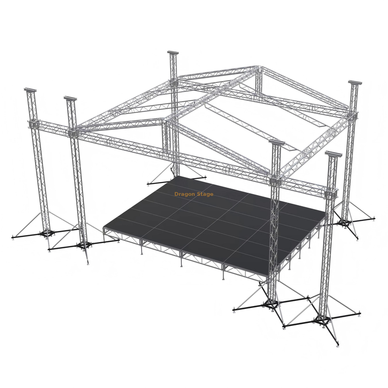 O sistema DragonStage Outdoor Customized Speaker Aluminum Truss Wings é uma estrutura imponente e abrangente projetada para produção de concertos profissionais e aplicações de eventos em grande escala. Dimensionado em substanciais 12 metros de largura por 8 metros de profundidade e atingindo impressionantes 12 metros de altura, este sistema fornece uma plataforma altamente visível e estruturalmente sólida para os palcos principais, completa com proteção total contra intempéries e suporte de equipamento de som dedicado.
