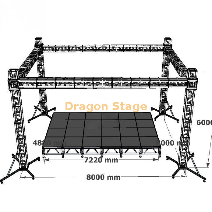 Cobertura expansiva: A estrutura de treliça de alumínio de 8m x 6m x 6m fornece capacidade aérea significativa para equipamentos de iluminação profissionais, sistemas de som e exibições visuais.
