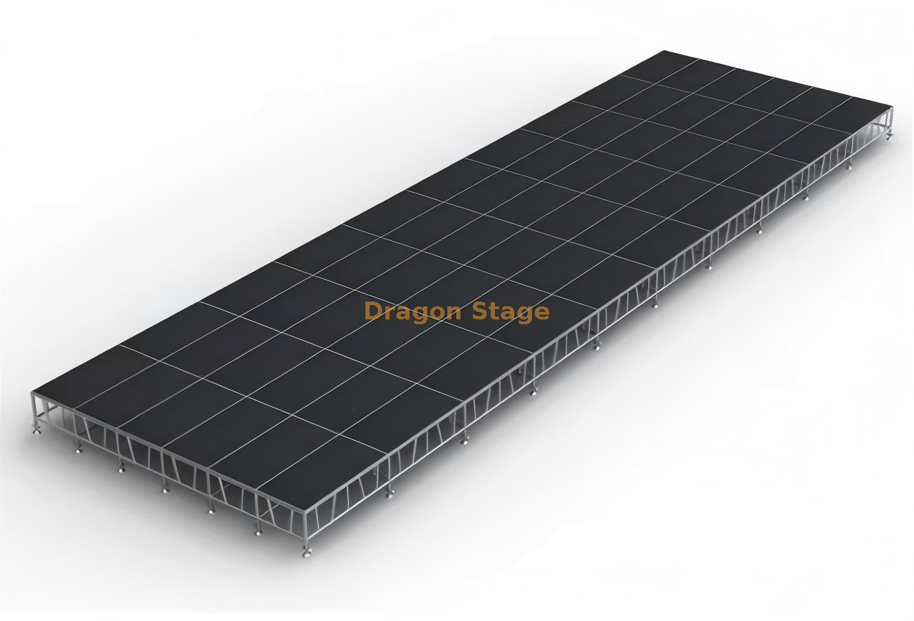 Design de segurança em primeiro lugar: Os decks do palco apresentam uma superfície laminada antiderrapante de alta densidade que permanece segura mesmo em condições climáticas úmidas.