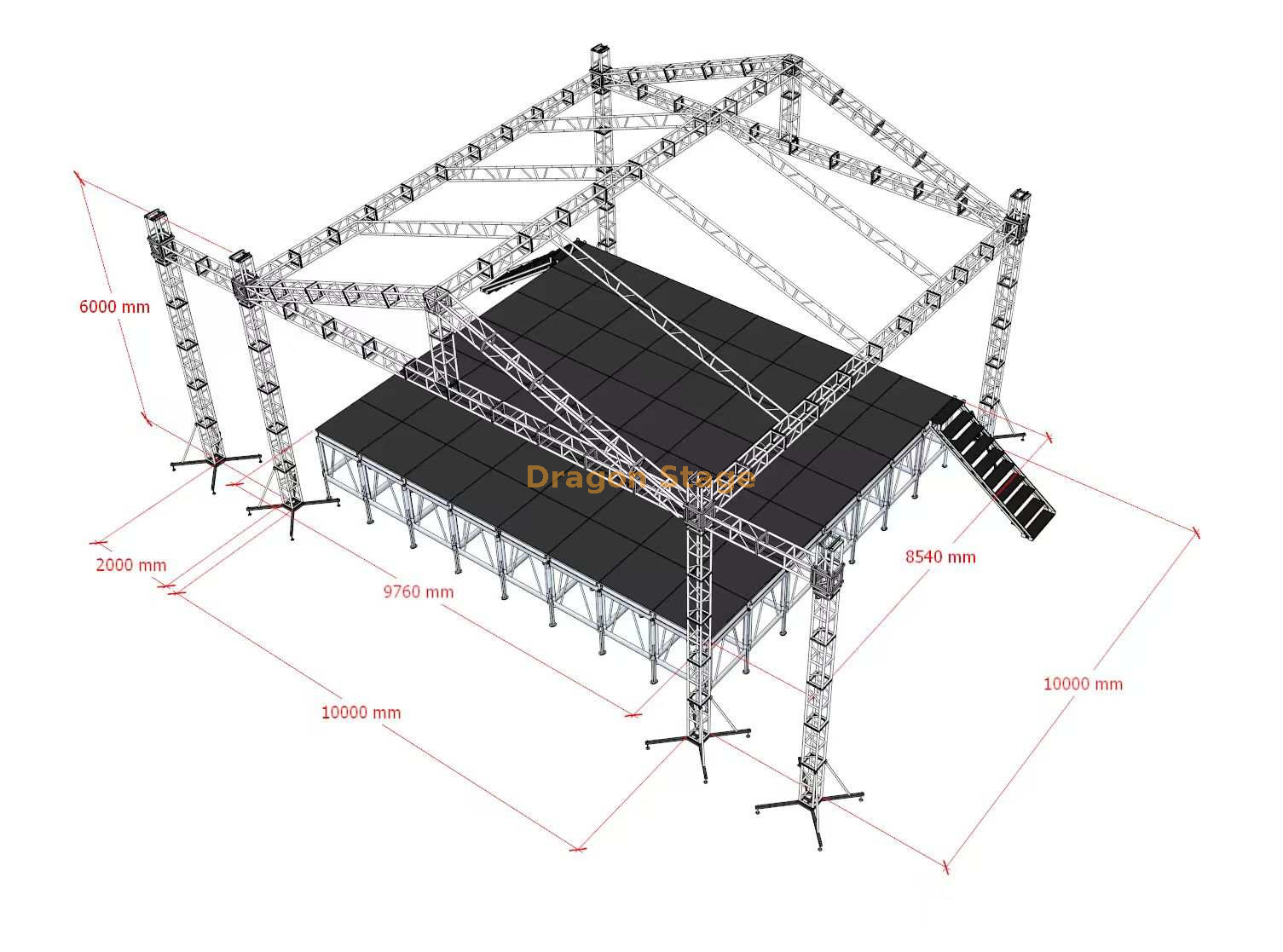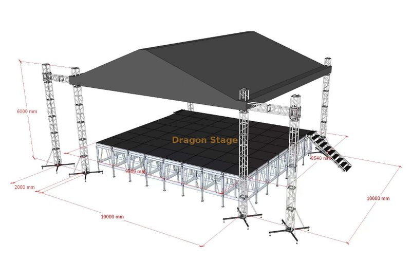 Este sistema profissional de treliça para telhado de duas inclinações de 10m x 10m é uma solução estrutural de alto desempenho projetada para ambientes de eventos de elite onde a estética e a capacidade de carga são críticas. Com uma distância vertical de 6 metros, este sistema oferece uma área de atuação abrangente de 100 metros quadrados com recursos audiovisuais integrados.