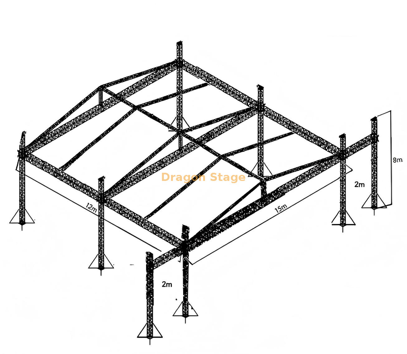 O Dragon Stage sistema de treliça de palco para eventos externos de altura ajustável de alumínio foi projetado para os mais exigentes concertos, festivais e eventos televisionados em grande escala. Este pacote abrangente apresenta uma estrutura robusta de telhado de treliça de 15m x 12m x 8m apoiada por seis pilares principais e inclui uma plataforma de palco extensa e ajustável. O sistema de suporte atualizado de seis torres oferece excepcional distribuição de carga e estabilidade ao longo do grande vão de 15 metros, tornando-o a principal escolha para grandes produções ao ar livre.