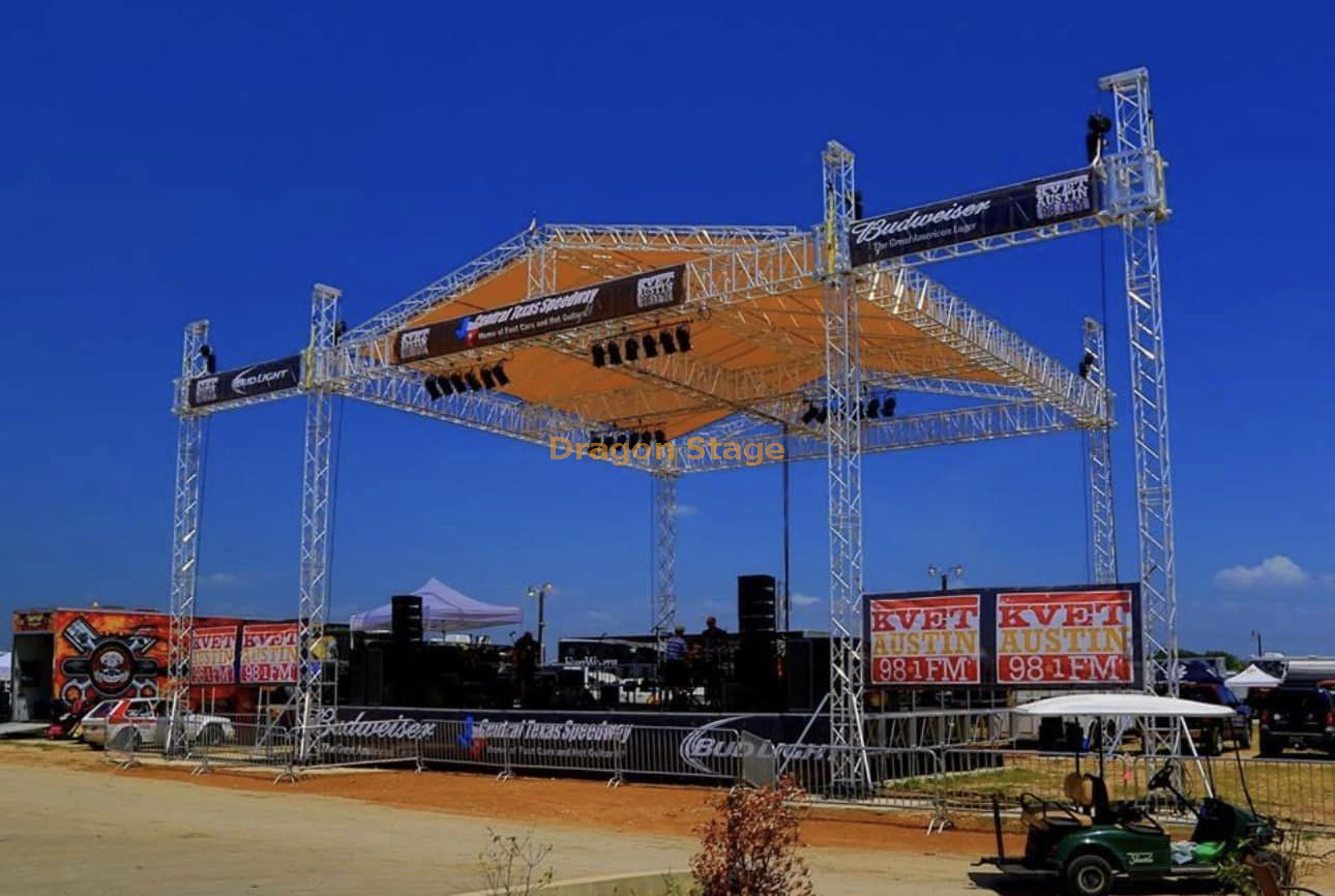 O acabamento em alumínio prateado proporciona um toque estético ao mesmo tempo que utiliza materiais resistentes à corrosão adequados para ambientes externos. Todo o sistema de treliça, incluindo as asas dos alto-falantes de 3,0 m de largura que são suportadas por suas próprias torres dedicadas, foi projetado para montagem modular rápida. A inclusão de 50 conjuntos de suportes e bases ajustáveis para a plataforma do palco garante um nivelamento preciso e seguro em vários terrenos externos (Fonte: https://www.dragontruss.com/STAGE).