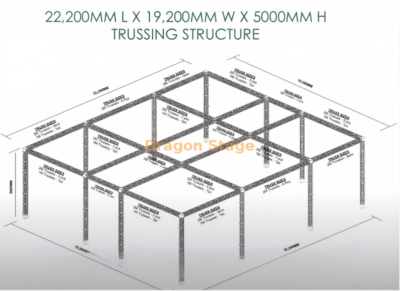 Este sistema de exibição de treliça modular profissional de 21m x 17m é uma solução estrutural de nível industrial projetada para grandes salas de exposição e marcas de eventos de grande formato. Com uma área total de 22.200 mm de comprimento e 19.200 mm de largura , este sistema fornece uma grade aérea incomparável para iluminação complexa, sinalização e suspensão de produtos.
